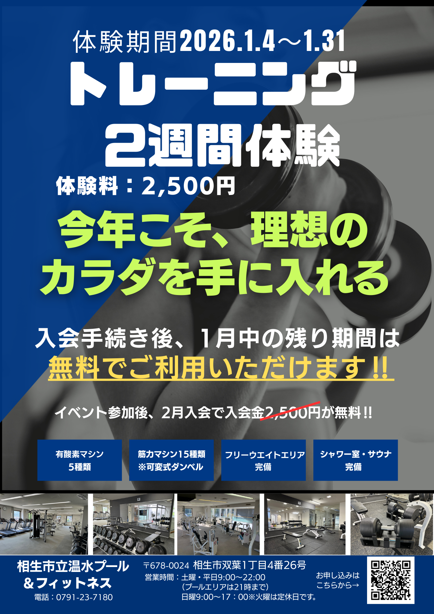 1月トレーニング2週間体験 【トレーニングイベント】 2026年1月4日(日)~1月31日(土)の期間、トレーニング2週間体験(2,500円)を実施します。 有酸素・筋力マシン、フリーウエイトエリア、シャワー・サウナをご利用いただけます。 入会手続き後は1月中の残り期間が無料、 体験後2月入会で入会金2,500円が無料となるお得なキャンペーンです。 お申込みはこちらをクリック👆