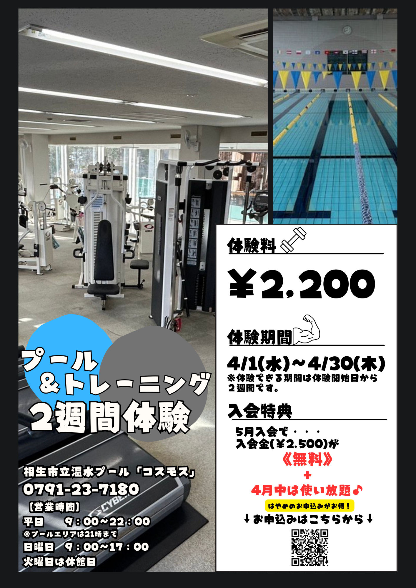 4月 プール&トレーニング 2週間体験 【4月 プール&トレーニング 2週間体験】 トレーニングジム・プールが使用できます。 体験して5月入会すると・・・4月30日(木)まで使い放題!のオトクな特典付き♬ お申し込みはこちら♬